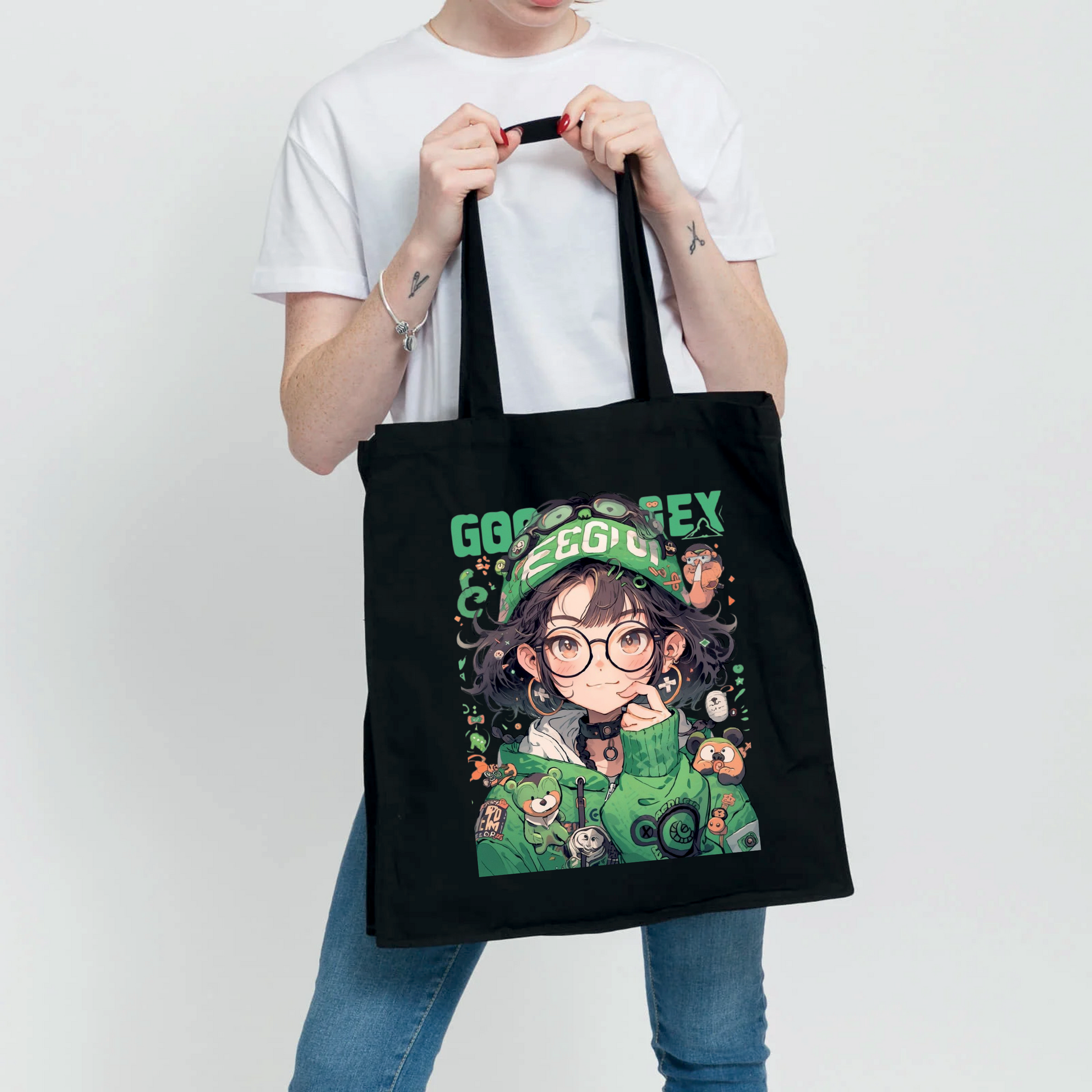 Pour les vrais gamers et fans d'anime ! Tote bag noir avec design manga ultra détaillé style gaming kawaii aux tons verts vibrants.