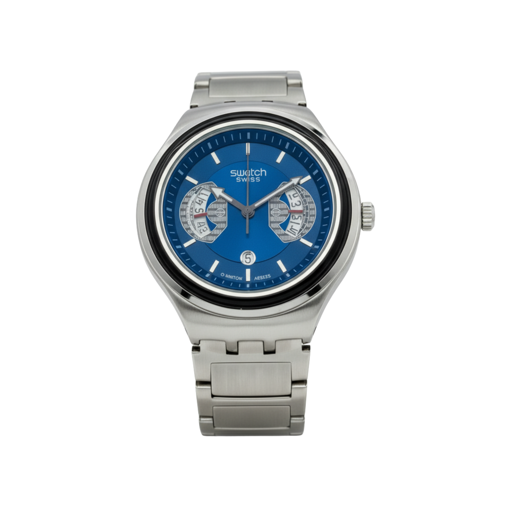 Rehaussez votre style avec la Swatch Irony Chrono YVS488G, alliant cadran argenté, accents noirs et bracelet en acier inoxydable.