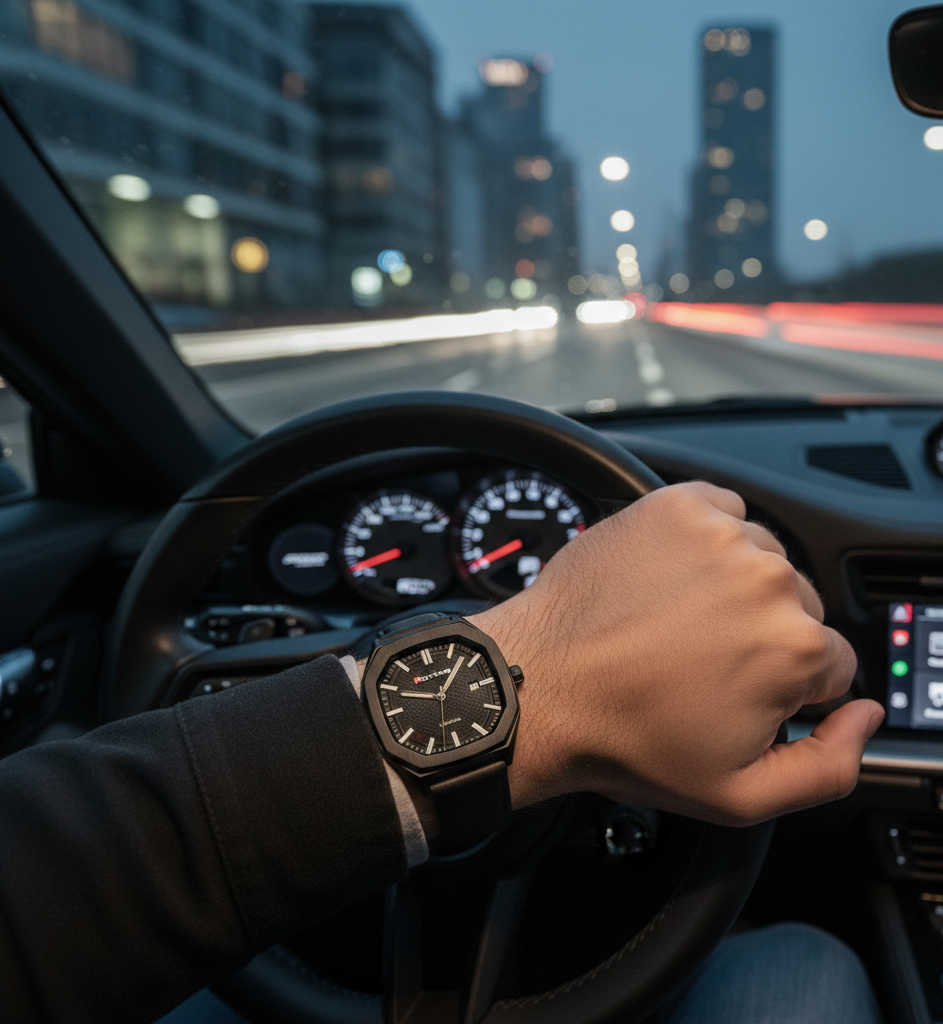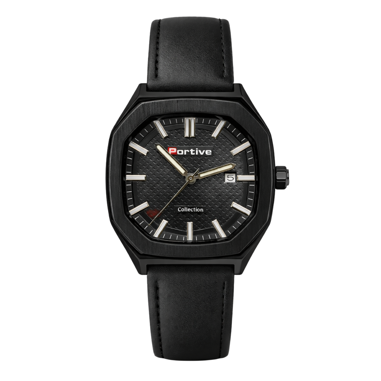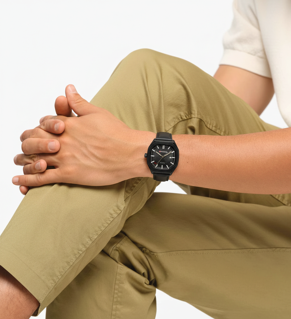 L'essence du style furtif et sophistiqué. Le design total black avec finition brossée sur le boîtier crée une esthétique monochrome puissante et contemporaine. Le cadran noir texturé révèle sa profondeur sous la lumière, tandis que les index luminescents garantissent une lisibilité impeccable. Pour l'homme qui maîtrise l'art de l'élégance discrète et de la présence affirmée sans compromis.
